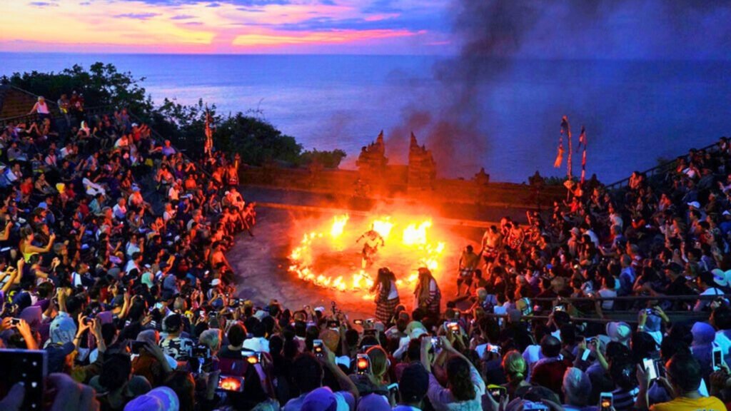 • Watch an Uluwatu Sunset & Kecak Dance: Journey to Uluwatu Temple, perched on a dramatic cliff at Bali’s southern tip, to witness a spectacular sunset over the Indian Ocean and the famous Kecak fire dance performance as darkness falls. It’s an iconic Bali experience – the chanting of the performers, the flames against the night sky, and the waves crashing below create an electric, romantic atmosphere.